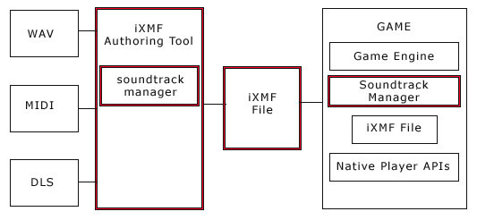 Goal Our goal is to provide a workable outline of a possible rollout plan for the rapid adoption of iXMF by the interactive audio community. Introduction Problem Statement: Developers, publishers and content creators are currently wasting time and money by working with multiple and incompatible audio systems. Even though there have been many advances in implementation tools, creative control is still often not in the hands of the audio artist and remains the responsibility of the game programmer. This compromises quality and wastes resources and these problems are exacerbated when developing multi-platform titles. Completion of the iXMF spec in itself is not enough to solve this problem so we are providing a roadmap for its accelerated adoption by the industry. What is iXMF? iXMF is a public standard structured audio file format that supports cross-platform interchange of advanced interactive audio soundtracks. It uses a que-oriented model, is programming-neutral, and can be used without license agreements or royalty payments. Current Status iXMF is a draft specification being finalized in the IASIG and should be ready for public release in the first half of 2004. Our plan consists of two sections: a technical plan and a promotional/publicity plan. Technical Plan Reference Code Diagram: Creating reference code