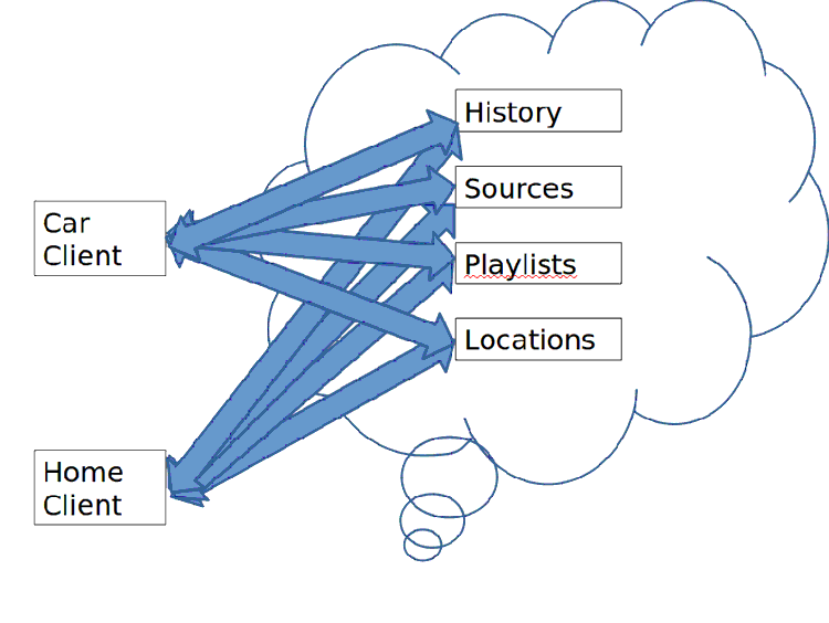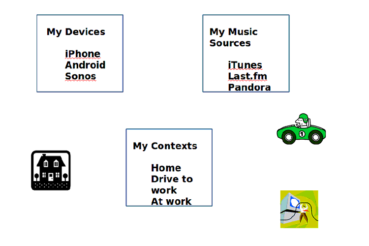 | The problem: Diverse media sources, devices, and contexts fragment the experience of using sound. A proliferation of devices and media sources has made accessing your music complicated and cumbersome. Additionally, audio routing today through multiple devices incurs multiple signal processors that may not be aware of each other and may be incompatible. Content is spread across a variety of sources, streamed and local. We use a variety of devices, each of which mixes music listening and voice communication functions. There’s no consolidated access to all of those sources, and no information about what you’re doing or where you are doing it. As you move from place to place, you want your audio to be associated with you, not only content sources and devices. Various components attempt to solve pieces of this problem. UPnP, DLNA, and zeroconf (Bonjour) address device discovery. Aggregators like lockers, RadioTime, Rovi, and Muse consolidate some media sources. Services like Last.fm track user listening data across players and devices. But these services don’t talk to each other, and the sum total of the services do not create or share enough information to allow seamless playback across systems and devices. This content will also need to be socialized and shareable with others in our social networks or living environments. The solution:Use the cloud to make audio devices aware of where you are and what you're doing. We believe the remedy to these problems centers around an online, connected service that catalogs a user’s devices, content and listening environments. We propose a cloud-based service that provides: