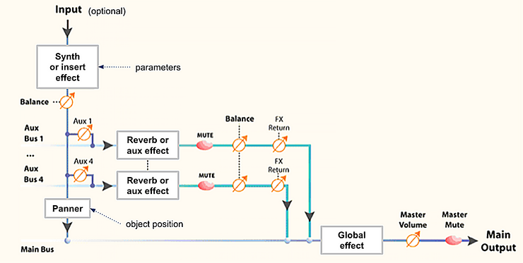 The above diagram illustrates a common mixing signal flow for music/movie production or games/VR/AR audio. Sound generation is performed in a first stage, including synthesis and optional insert effects, and produces a single or dual-channel audio signal. This signal is then subject to a spatialization process including spatial “panning” and artificial reverberation.