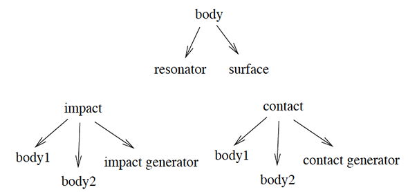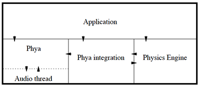 Main objects in Phya, with arrows pointing to referenced objects. Sound spatialization It is preferable to keep spatialization as separated as possible from sound generation, if possible. A large body of algorithms and software exist for spatializing, and the best approach depends on the context of the application. Output from Phya is available as a simple mono or stereo mix, or separately from each body so that external spatialization can be applied. Advantages Physical principles guide the system design, combined with judgments about what is perceptually A source can be given directionality by filtering the mono signal to produce a signal that varies with direction from the source. This technique is often used in computer games, and can be applied as part of the external spatialization process. Mono synthesis followed by external filtering can reproduce directional sound correctly, because at each frequency the directionality is fixed. For sources in general the directionality at each frequency can vary over time. Challenges Necessary to separate/categorize different types (“profiles”) of interaction and resonators . A machine learning approach? Existing work Speech synthesis using neural networks