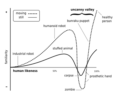 The uncanny valley of audio Uncanny Valley: the phenomenon whereby a computer-generated figure or humanoid robot bearing a near-identical resemblance to a human being arouses a sense of unease or revulsion in the person viewing it.