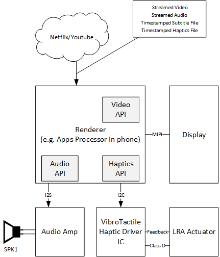 While seemingly humorous at first glance, the possibility of remote physical links is an interesting one. It is our belief that beyond gaming, adult content is a strong driver of technological innovation in haptics. Beyond the purely sexual, physical long-distance touch is an intriguing use of haptics. In a Kotaku post (https://kotaku.com/long-distance-relationships-suck-but-vrs-made-it-easie-1775615168) writer Nathan Grayson wrote a fascinating article about the power of VR to provide closeness in an interaction with a loved one: “We held hands. We hugged a couple times. It was just really nice, despite the lack of so much as a controller rumble when we touched.” That article was written in 2016, but even then, the lack of haptics technology was noticeable. Haptics has a true potential to make such interactions much closer, using VibroTactile (touching someone's arm), Thermal (warmth of other users hand), Skin Stretch (a hug) etc. On the vibrotactile side, such content wouldn’t be expected to be repeated and would likely be dynamically authored and streamed (potentially from one client to another). The low bandwidth nature of MIDI would be an excellent method to transmit from one user on one side of the planet to another, and allow the receiver rendering device to downmix to whichever transducers were in the receiver. On the content creation side, this was probably one of the most complex use cases as individual interactive objects would require their own characteristics to be created. (e.g. playing piano for your partner - force, temperature, texture of the key’s alone would require significant authoring skills - likely custom tools would be required within Unity etc). This topic also introduced the concept that differing human gender may require different actuators, placed differently, with different capabilities. Not every human being is the same. That could be addressed by allocating a specific number of NOTES to “unallocated body location #” and using MIDI’s SysEx commands to name the actuator positions for the renderer, which would then allocate the haptics signals as required for the user (e.g. user may be wearing a female haptics suit, where and what transducers should be actuated). We anticipate leaving blank a number of possible body locations in our specification for either expansion of existing content or personalized touch locations. Proposed Solution In each of the use cases above, there is a Media Renderer (e.g. Apps processor in a mobile phone). Haptics Transducers or Driver ICs are expected to be connected to the the Apps processor.