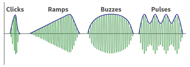 Modes of operation: Each transducer shall have multiple different modes of operation that maps the MIDI data presented into different decoding. Mode of operation is set on CC15, allowing a different mode of operation for channel. As multiple channels can use the same transducer type, it allows some transducers to be in one mode, whilst others are in another. For example, Ch0 could have Vibrotactile that are simple streamed envelope haptics (running at resonant frequency) while Ch1 could be in Triggered Patterns, where the stored sample is a heartbeat effect that gets played repeatedly to build tension. Modes of operation for all the different transducer types are open for continued work. For the sake of example, Vibrotactile modes of operation are below. They are based on existing smartphone/gaming/VR Haptic Driver IC Technology (DA7280) Example: VibroHaptic Modes of operation We envisage 3 basic modes of operation: These are dependent on the level of detail required (i.e. fidelity) and dynamic versus “baked” content.