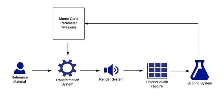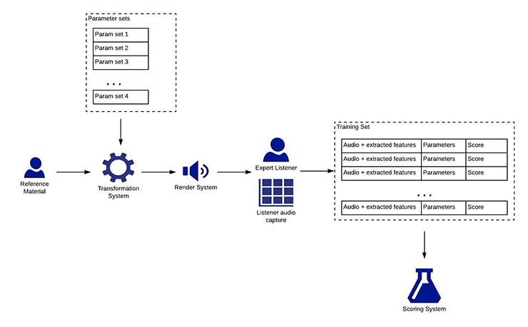 This diagram illustrates how ML can be employed to build a scoring system that determines the subjective quality of a transformation system. During the training session, the transformation system is fed a list of sets of control parameters, one at a time. For each parameter set, the expert listener assigns a score such as “0% (terrible)” or “100% (perfect). The listener’s score, plus the parameters that were fed into the transformation system, plus extracted audio features from the captured sound, provide the training for an ML based scoring system.